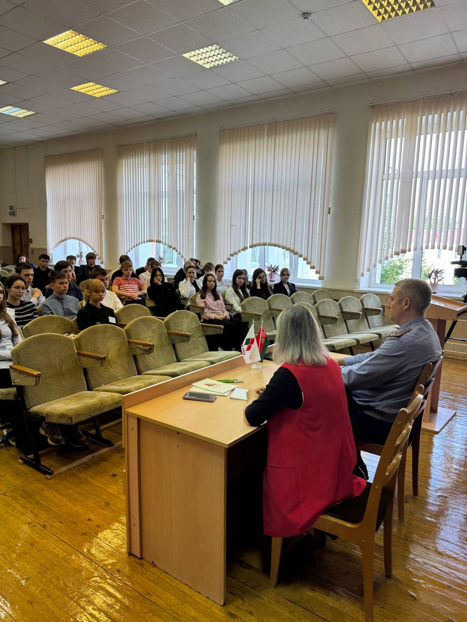 9 сентября в ГУО “Молодечненская средняя школа №4” состоялась встреча учащихся с депутатом Молодечненского районного Совета депутатов, заместителем начальника Молодечненского РОВД Сергеем Гелдой и председателем Молодечненской районной организации общественного объединения «Белая Русь» Ириной Поцелуевой.
