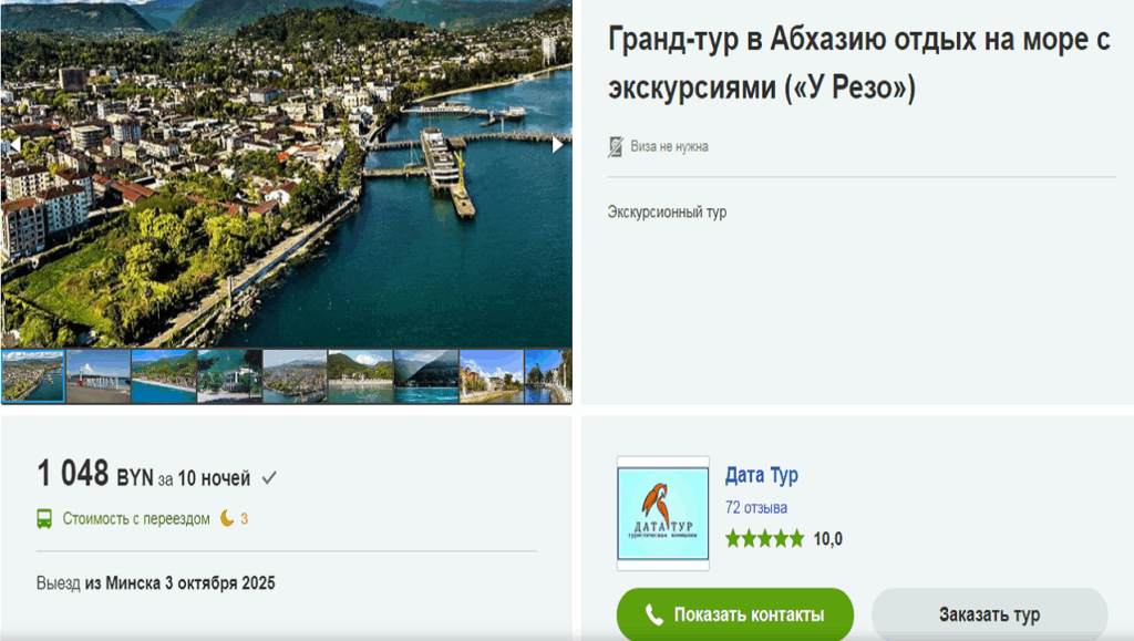 Без визы в октябре можно съездить в Грузию (курорты Батуми, Кобулети, Гонио). Правда, не стоит рассчитывать на теплое море и солнце, так как температура воздуха в это время редко поднимается выше плюс 20 градусов. Поездка на 9 дней на море (без учета дороги) обойдется в среднем около 400 долларов по курсу на человека. В эту сумму обычно включаются экскурсии и завтраки. Также без визы доступен экскурсионный тур в Абхазию (выезд из Минска) с отдыхом на море в Сухуми. Такая поездка обойдется в 1048 белорусских рублей на человека (10 ночей).