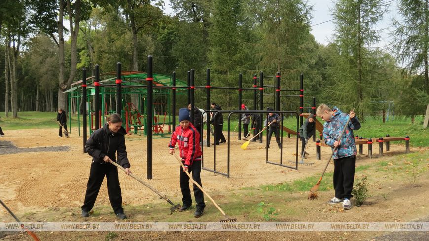 Не успели осмотреть спортивный комплекс тренажеров, как семиклассники Березинской средней школы нагрянули в парк и стали сгребать опавшие с деревьев у площадки с тренажерами листья. Когда работа была выполнена, педагог разрешила мальчишкам встать на тренажеры.
