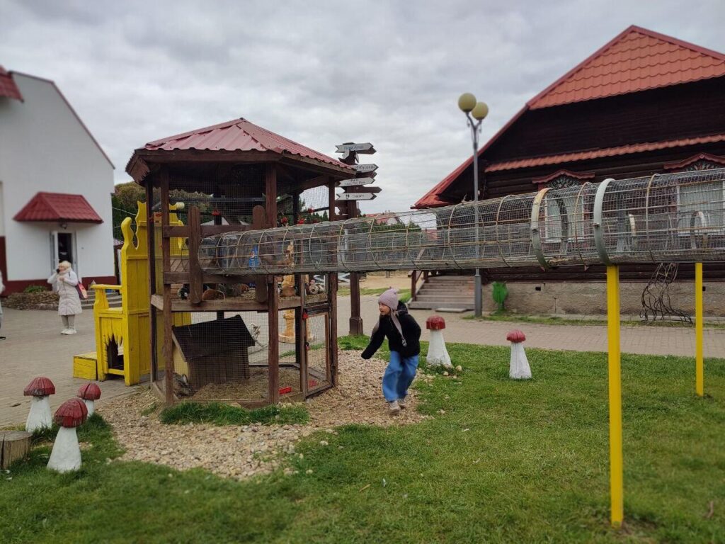 Для более внушительного приема пищи на территории есть кафе «Избушка». Летом здорово посидеть на террасе, наблюдая за муфлонами. Осенью лучше внутри, у печки. Шаурма там стоит 10 рублей, хот-дог – 5. Куриный супчик 6 BYN. Блинчики – от 6.5 до 10. Драники – 8.50.