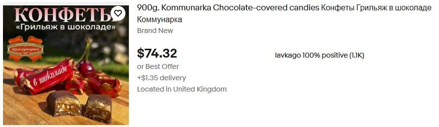 Также мы нашли на ebay белорусские конфеты «Птичье молоко» в упаковке по 850 грамм ($70,43/200 BYN), коммунарковский шоколад 200 грамм «С соленой карамелью» ($7,42/21 BYN), конфеты «Минчанка» в упаковке по 850 грамм ($57,46/164 BYN).