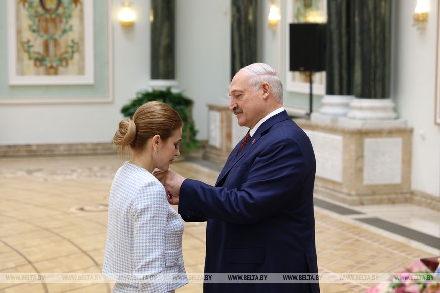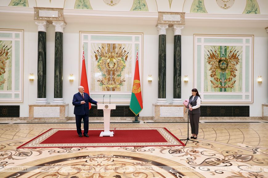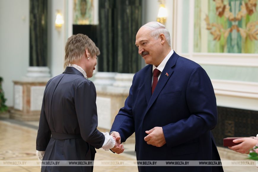 Глава государства вручил орден Почета начальнику управления образования Гродненского райисполкома Татьяне Аксамит, медаль “За трудовые заслуги” – начальнику производства ООО “Управляющая компания холдинга “Белорусская кожевенно-обувная компания “Марко” Анжеле Алферонок, инженеру-технологу технического отдела Оршанского льнокомбината Ирине Беляковой, ведущему научному сотруднику отдела технологии плодоводства Института плодоводства Надежде Капичниковой.