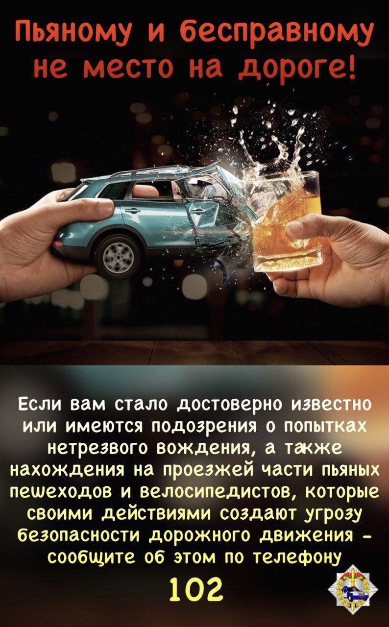 Не оставайтесь равнодушными и безучастными. Если вы видите или знаете, что транспортным средством управляет водитель в состоянии опьянения, сообщайте на телефонную линию 102.